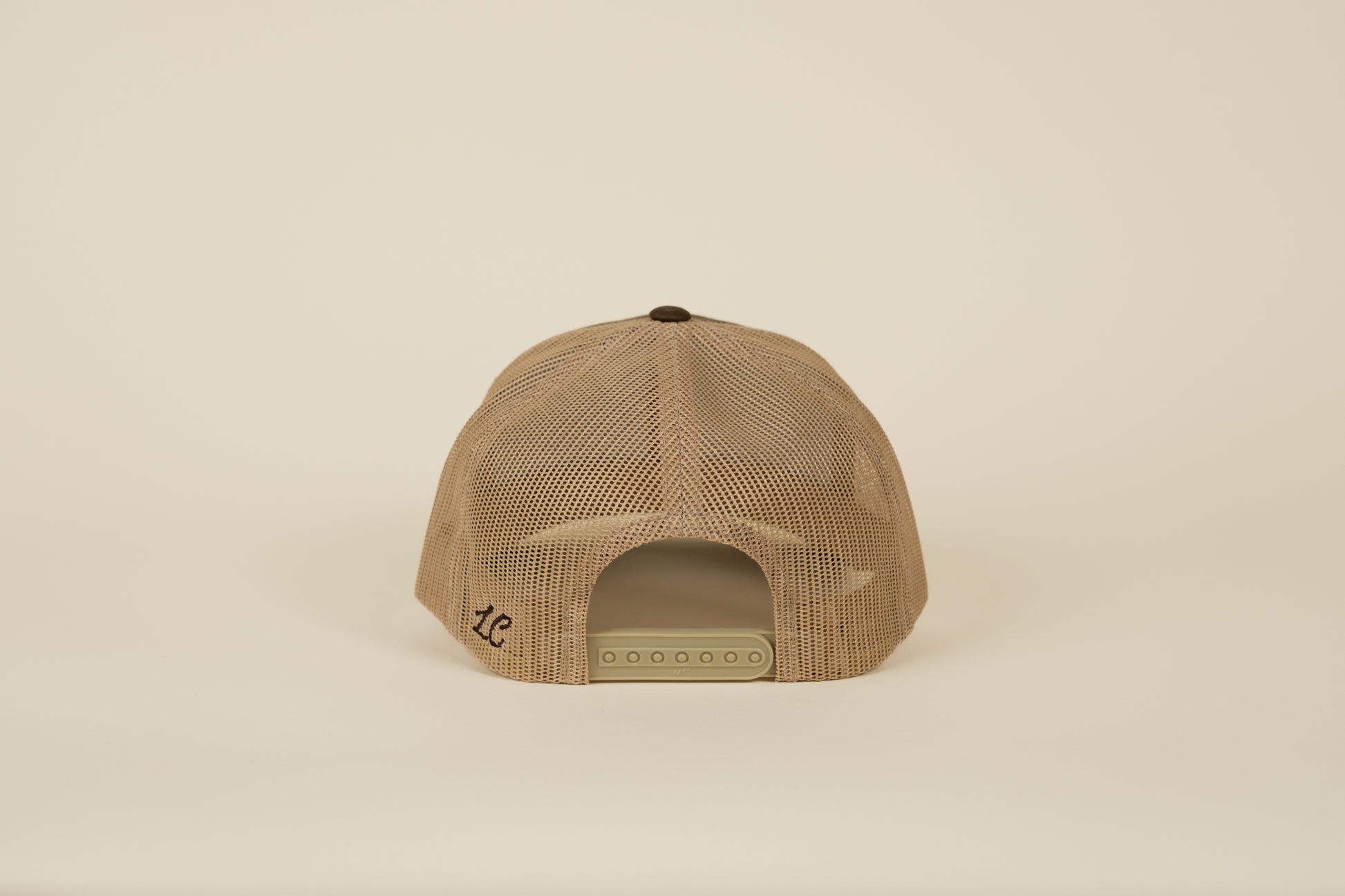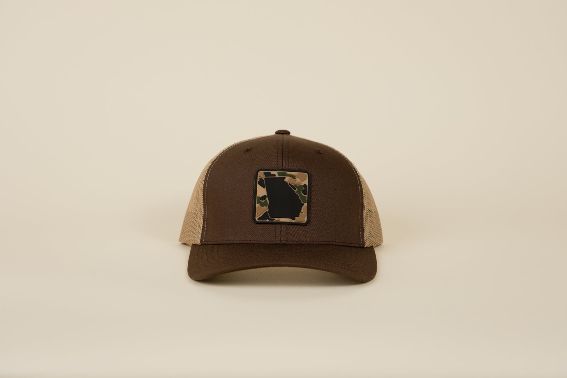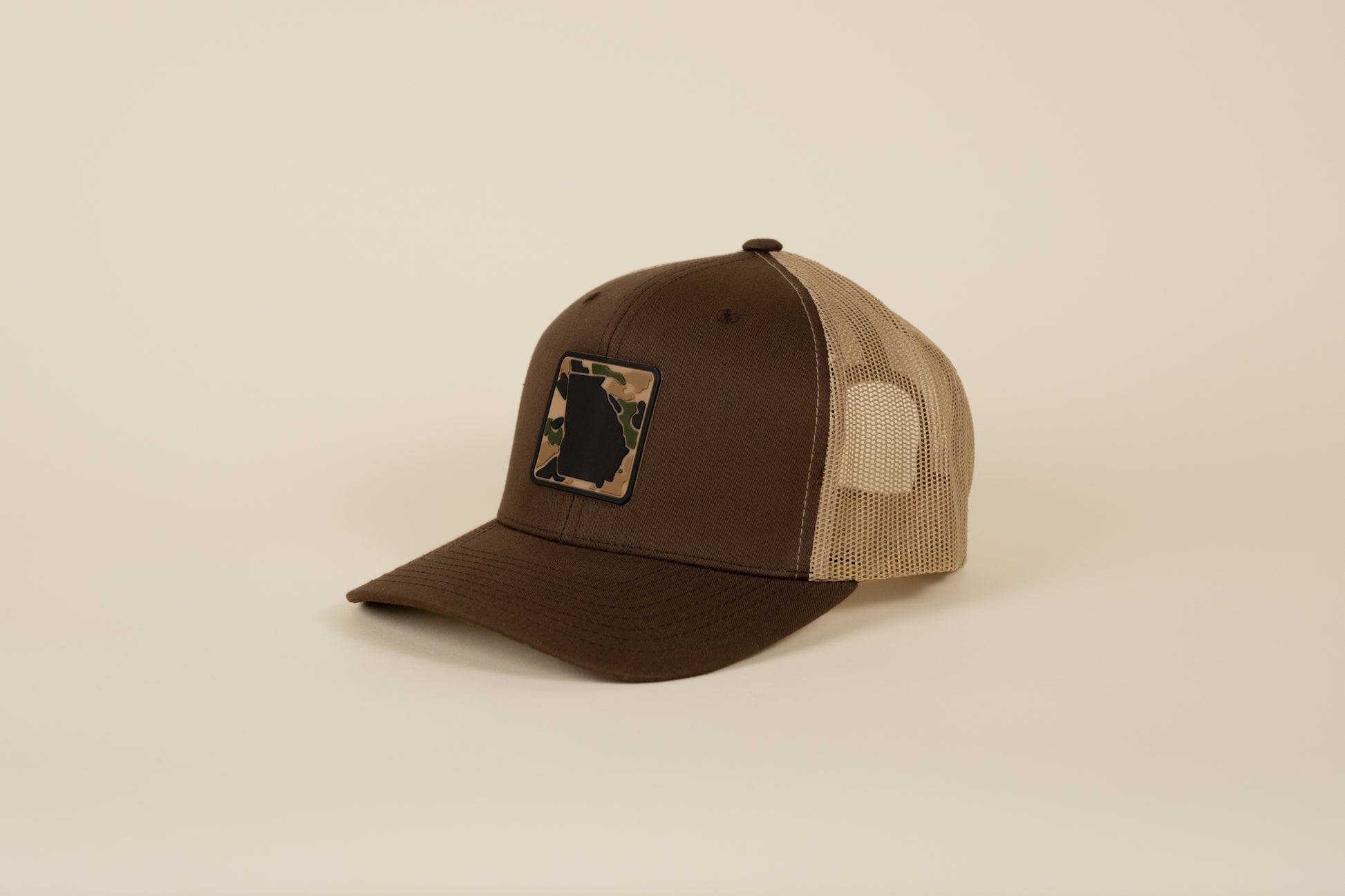 Classic trucker hat with mesh back, featuring a GA outline design. Ideal for the outdoors, offering breathability, style, and an adjustable fit for everyday comfort and durability. One Size Fits All.