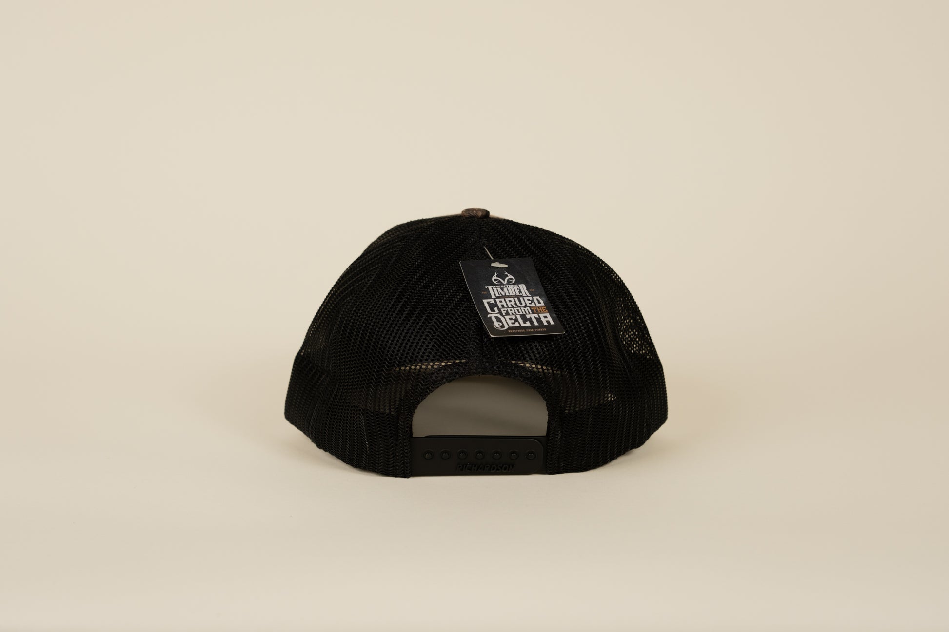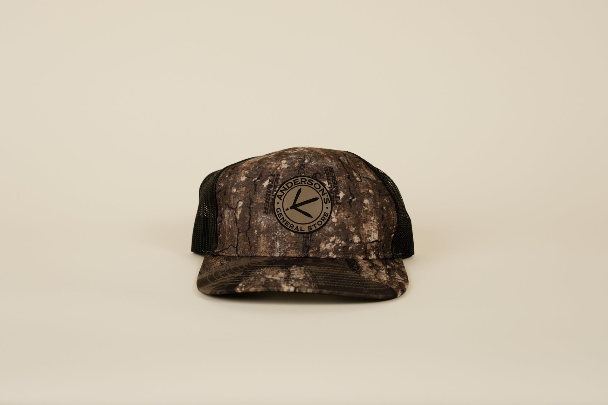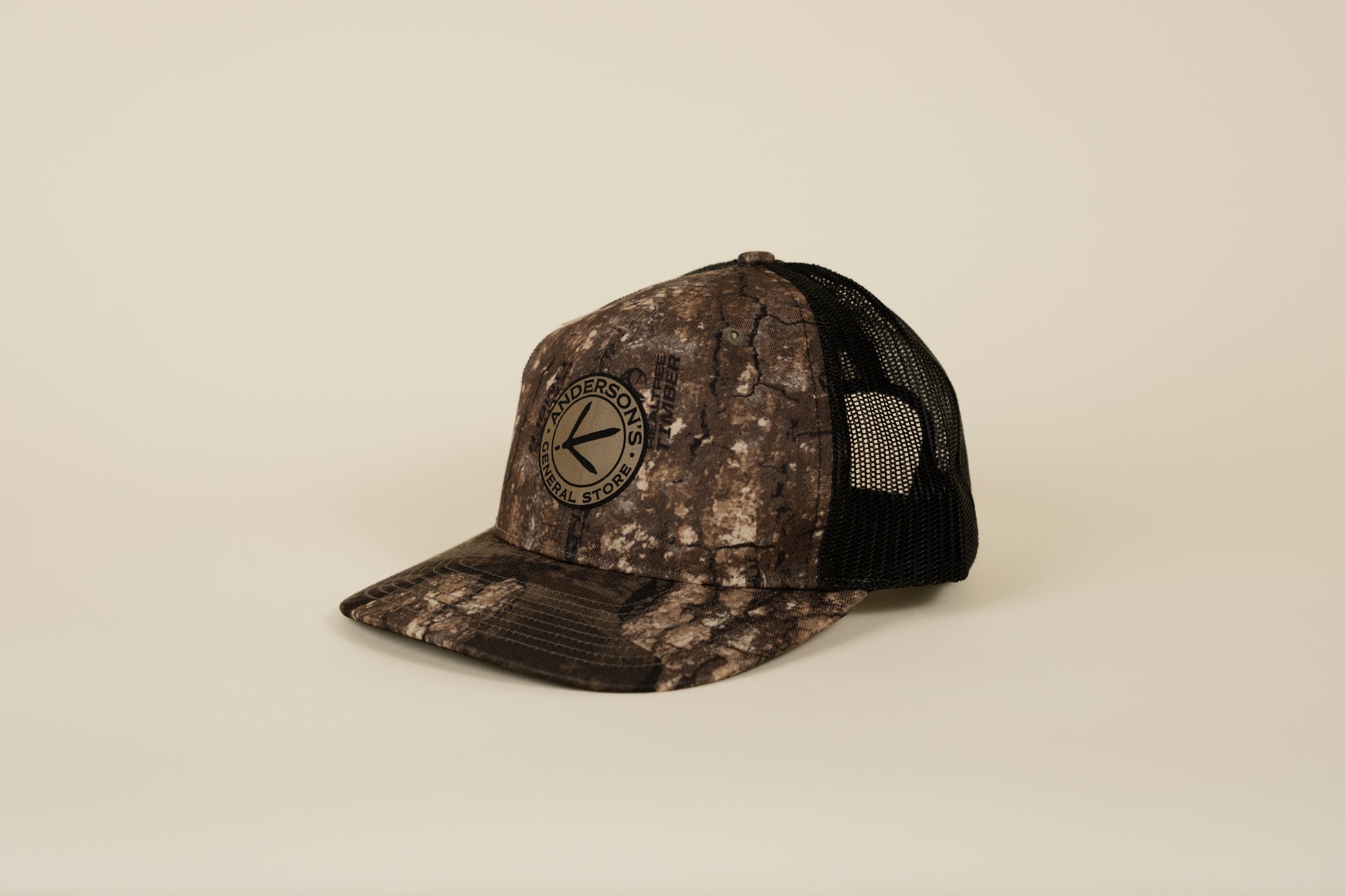 Classic trucker hat with mesh back, featuring a leather Anderson's patch with a Turkey Track. Ideal for the outdoors, offering breathability, style, and an adjustable fit for everyday comfort and durability. One Size Fits All.