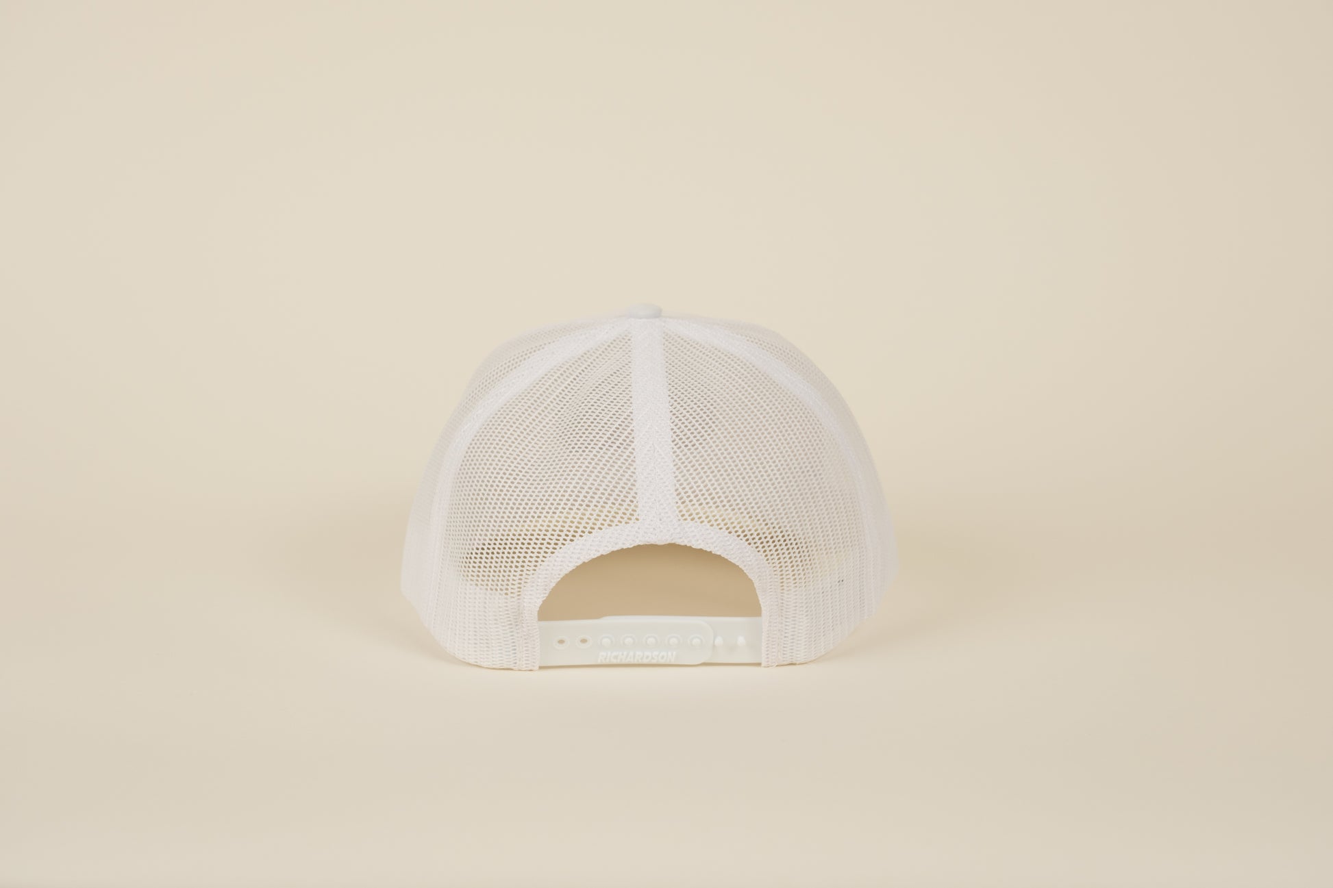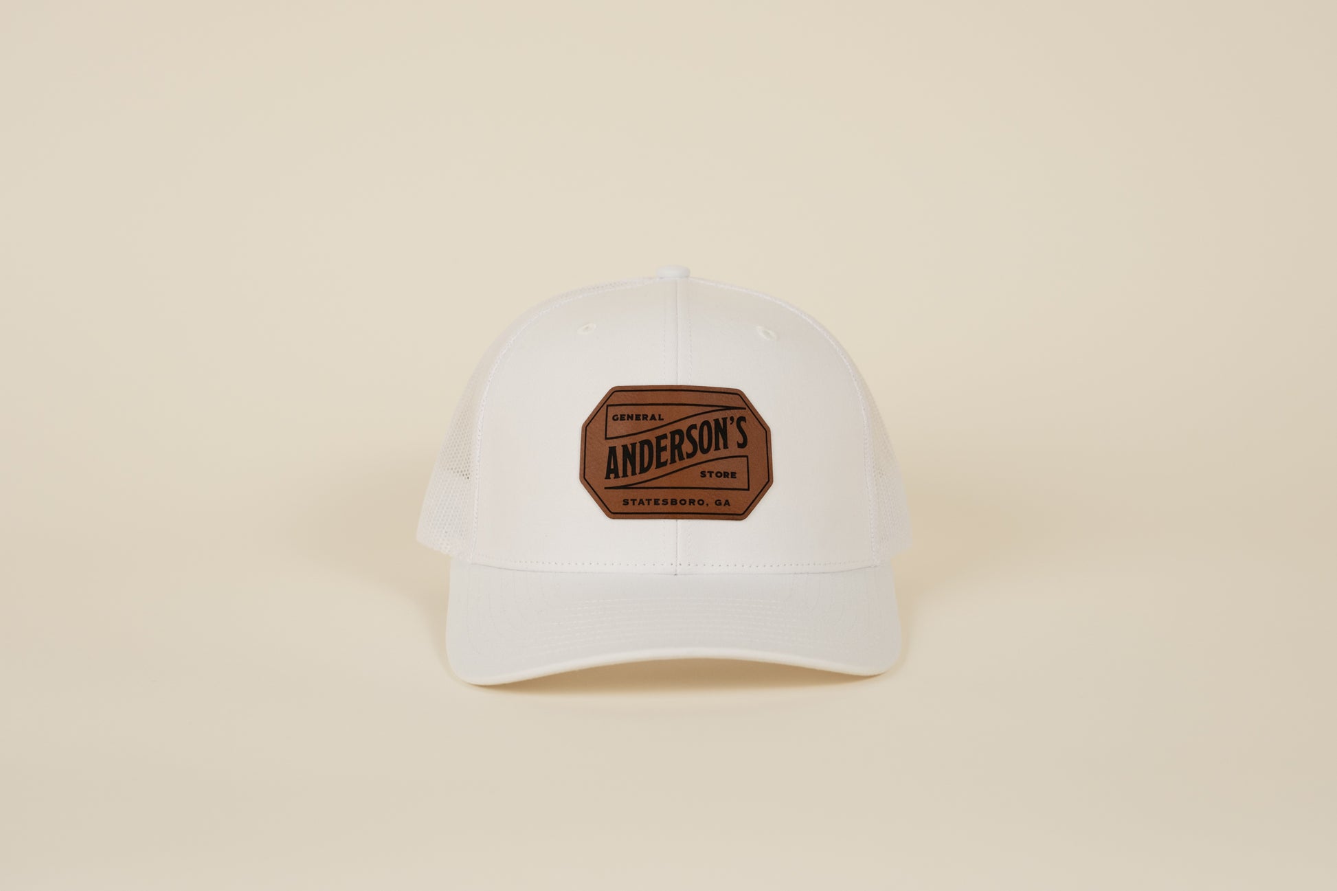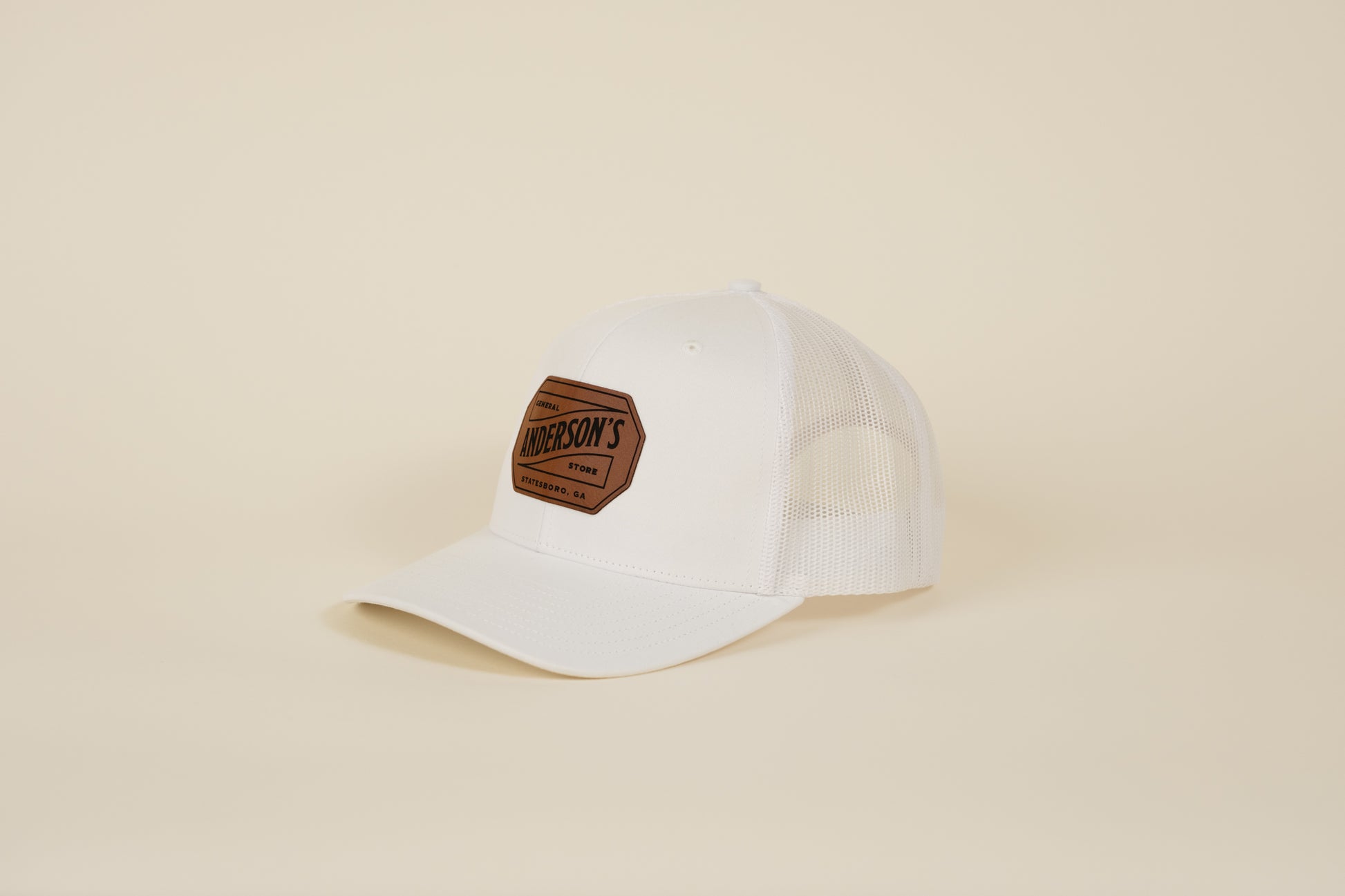 Classic trucker hat with mesh back, featuring a leather Anderson's patch. Ideal for the outdoors, offering breathability, style, and an adjustable fit for everyday comfort and durability. One Size Fits All.